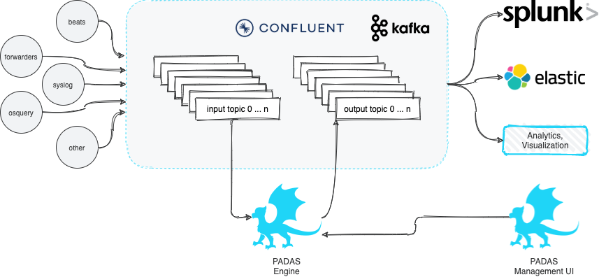 PADAS is built on top of robust Confluent Kafka Platform and enables organizations to transform, analyze, and filter TBs of streaming data in real-time. The goal is to keep things simple and take some of the burden away from existing SIEM and Analytics platforms by running various pipelines (combination of tasks that perform transformations and detections). PADAS comes with out-of-the-box integration examples (e.g. Winlogbeat, Splunk) and ready-to-implement rules pertinent to MITRE ATT&CK Framework. Any other custom rules can also be added (via PDL) without any dependency to existing SIEM or Analytics infrastructure.